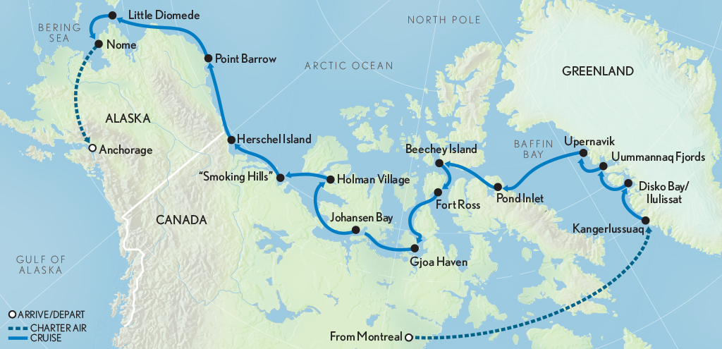 - Cruise the full extent of the Northwest Passage for 21 nights, voyaging from Greenland to the Canadian Arctic to the Bering Sea and ending in Alaska